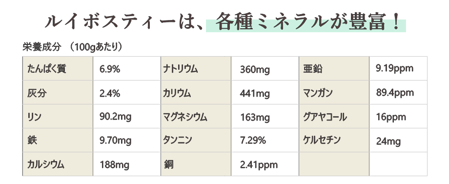 ルイボスティーは、良質のミネラルをはじめフラボノイド等がバランスよく含まれています。