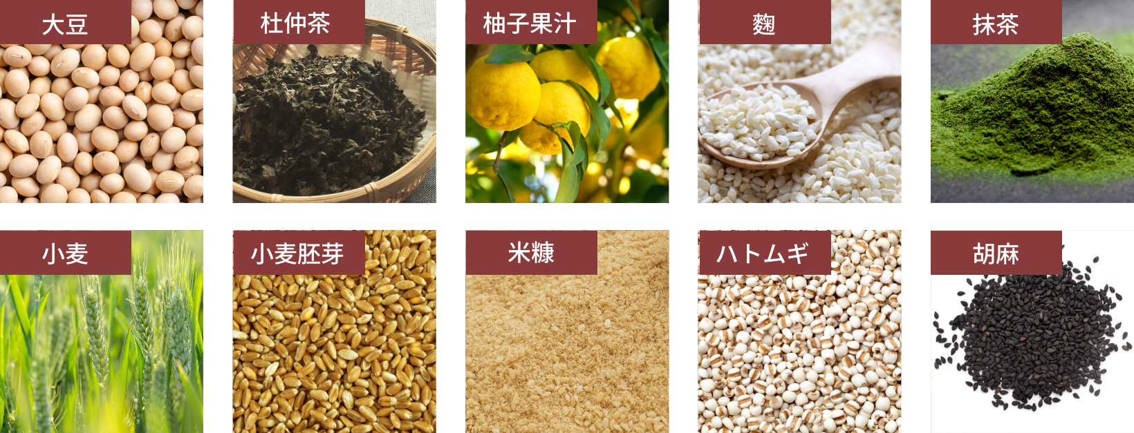 小麦胚芽、大豆、米糠、ハトムギ、小麦、ゴマ油、ゆず果汁、抹茶、杜仲茶、ごま、麹(米)、天然植物・穀物を厳選して選んでいます。