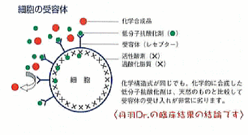 口から食べる場合は調理をするために熱を加えること、そして、胃液に洗われるという二つのファクタ-が入るため、「生きもの」である高分子のSOD・カタラ-ゼ酵素類は死んでしまいます。