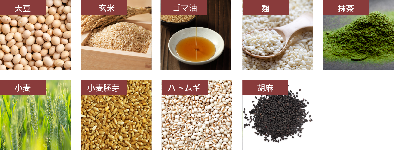 小麦胚芽、大豆、米糠、ハトムギ、小麦、ゴマ油、ゆず果汁、抹茶、杜仲茶、ごま、麹(米)、天然植物・穀物を厳選して選んでいます。